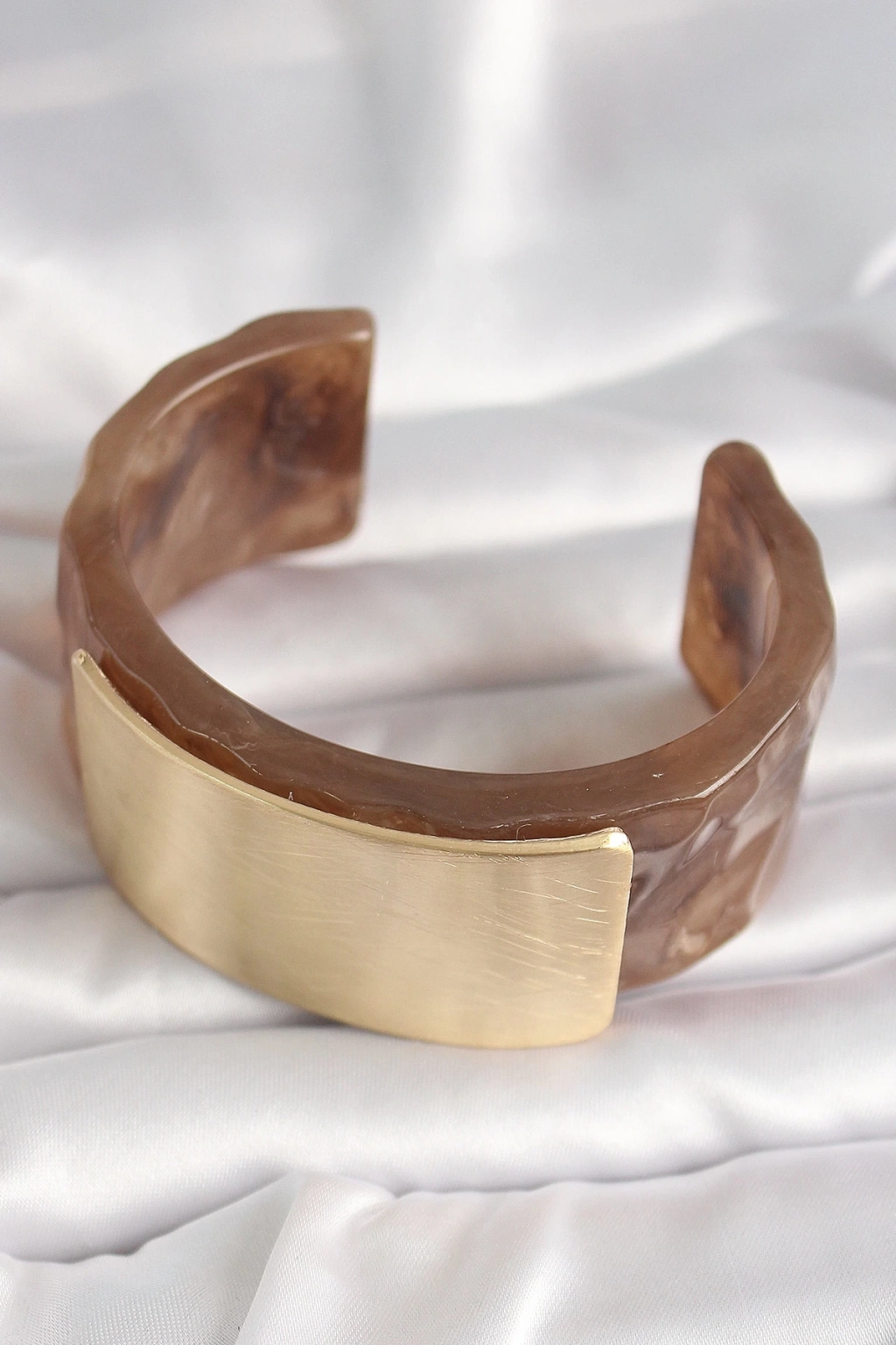 ® Kahverengi Mermer Desen Akrilik Platik Gold Dikdörtgen Plaka Model Vintage Kadın Bilezik