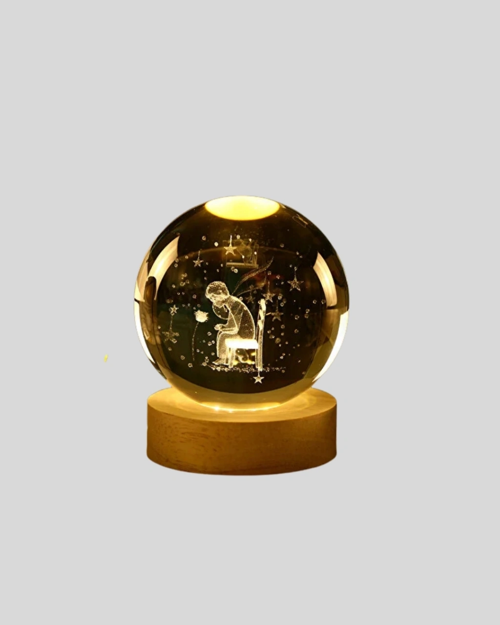 Küçük Prens cam küre lambası, USB bağlantı özelliği sayesinde her ortamda kolayca kullanılabilir. Bilgisayar, powerbank veya adaptör üzerinden hızlıca çalıştırılır. Ahşap altlık, küreyi sabit tutar ve kaymayı engeller. Büyük boy 8 cm cam küre yapısı, ışık açıkken etkileyici bir parıltı oluşturur. Hem gece lambası olarak hem dekoratif obje olarak kullanım için idealdir. Odalara sıcak, romantik ve sakinleştirici bir ışık yayar.