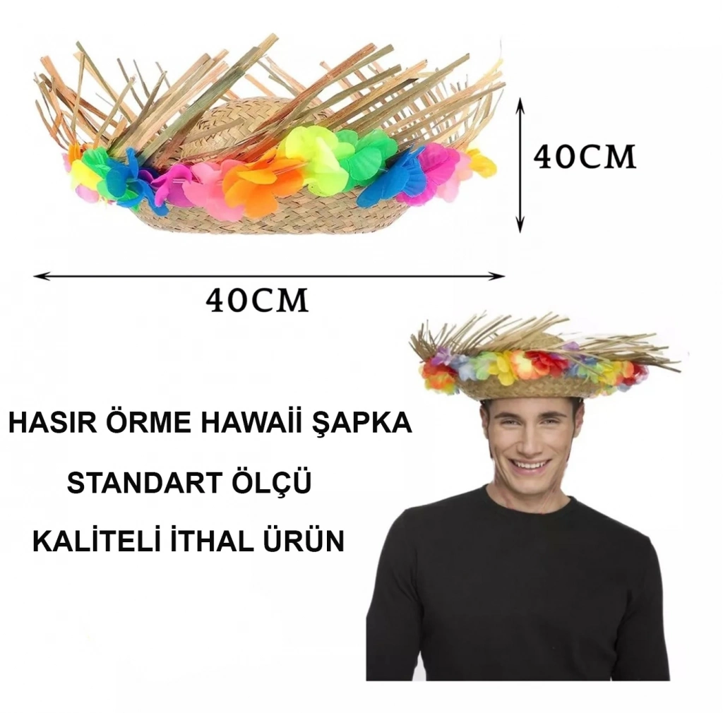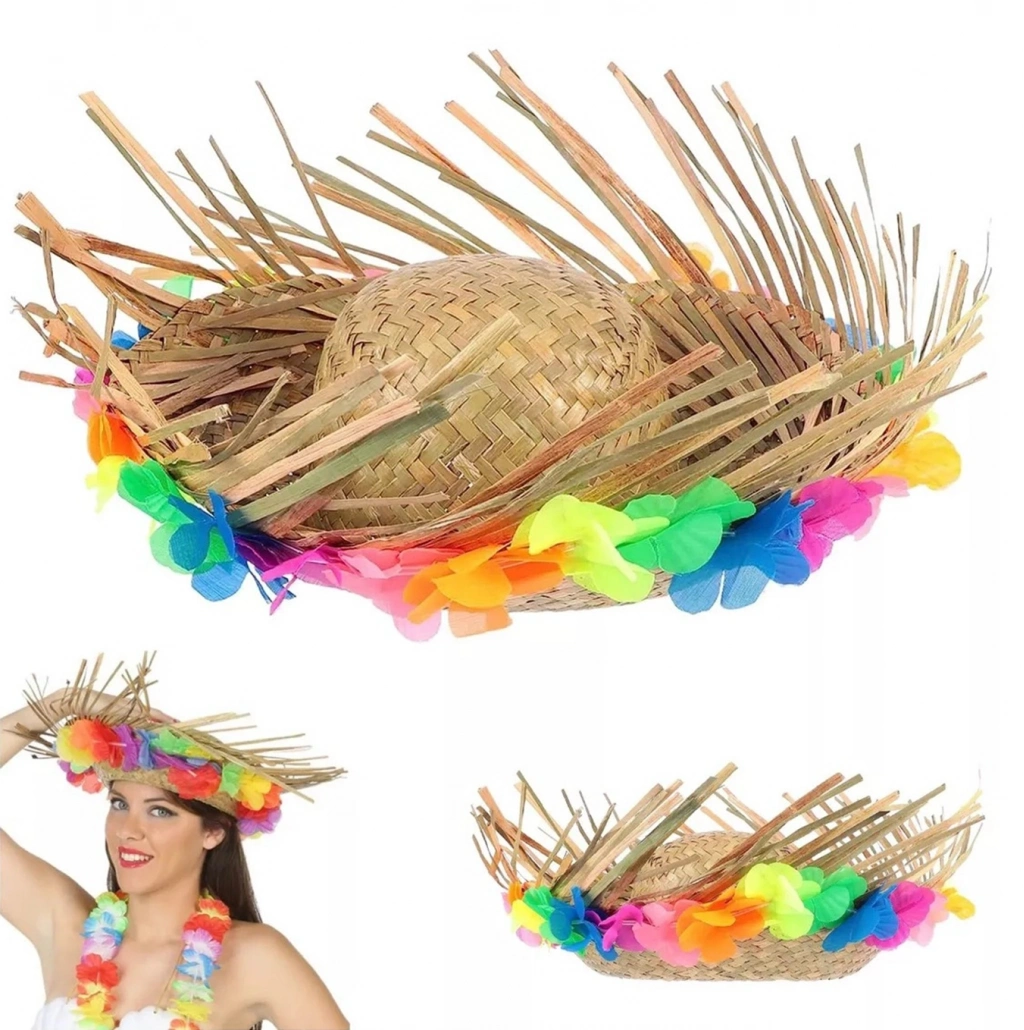 Naturel Renk Püsküllü Örme Hasır Hawaii Luau Aloha Şapka 13x36 cm