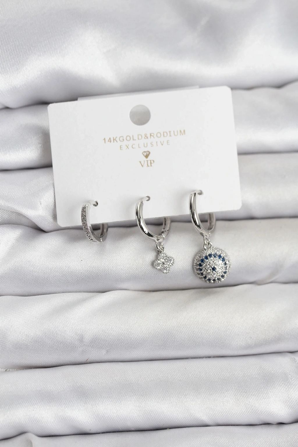® Nazar Model Gümüş Renk Pirinç 3'lü Kadın Küpe Seti