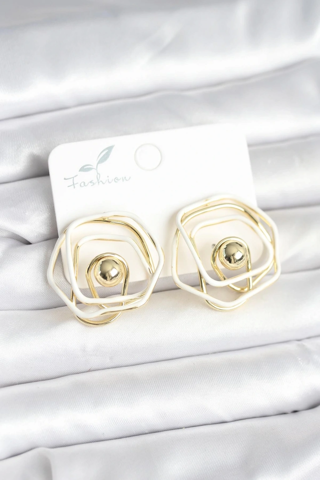 ® Pirinç Gold Renk Beyaz Mineli Geometrik Gül Model Kadın Küpe