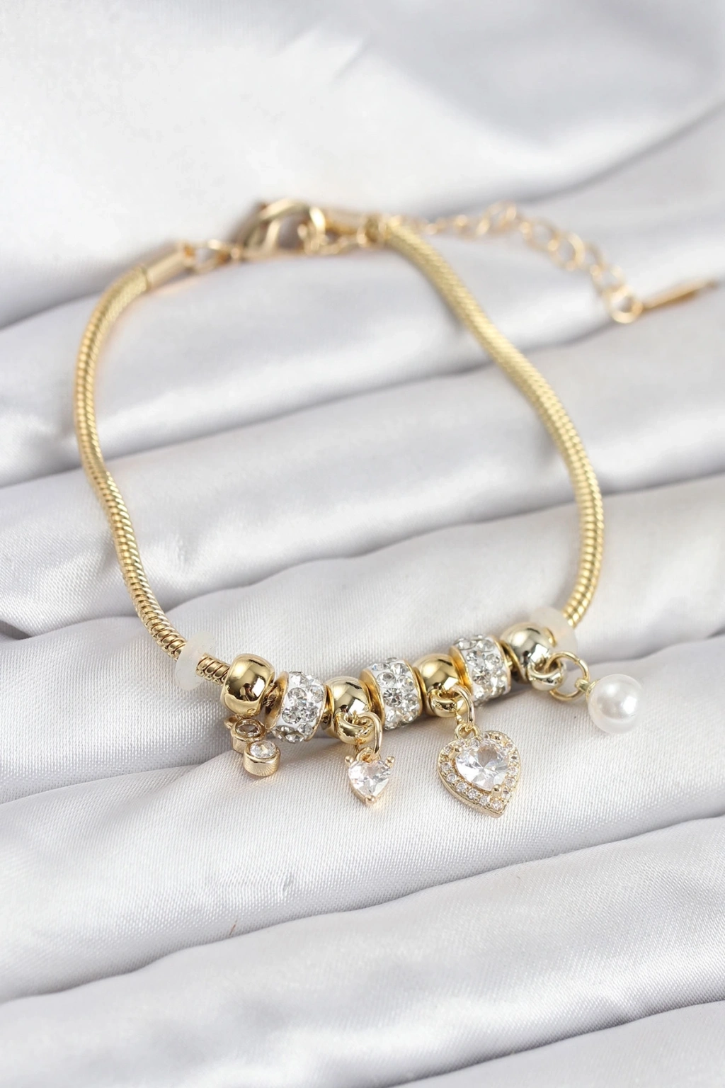 ® Pirinç Gold Renk Kalp Charmlı Kadın Bileklik