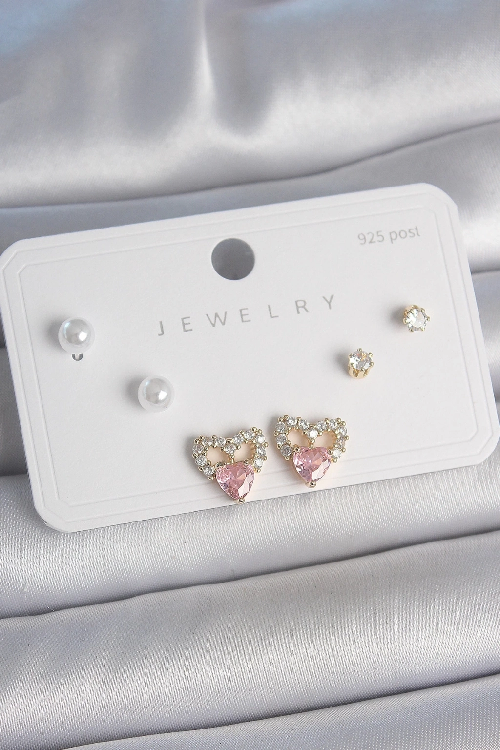 ® Pirinç Gold Renk Pembe Zirkon Taşlı Kalp Model İnci Detay 925 Ayar Kadın Küpe Seti