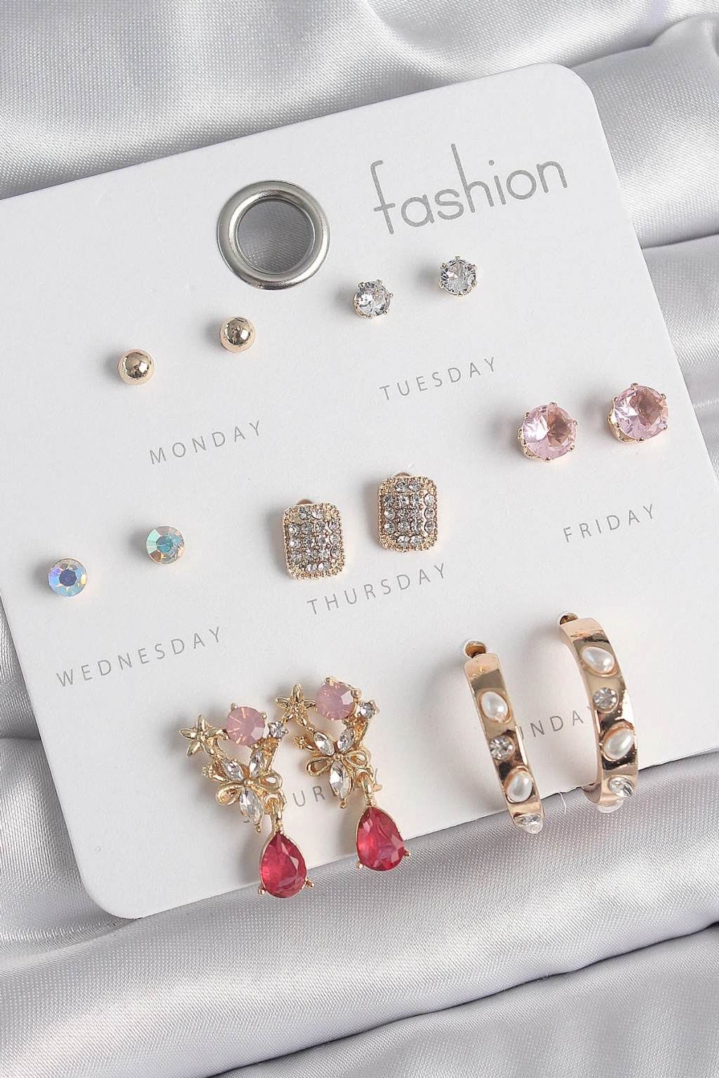 ® Pirinç Gold Renk Zirkon Taşlı Çiçek Figür İncili Halka Figür 7 Çift Kadın Küpe Seti