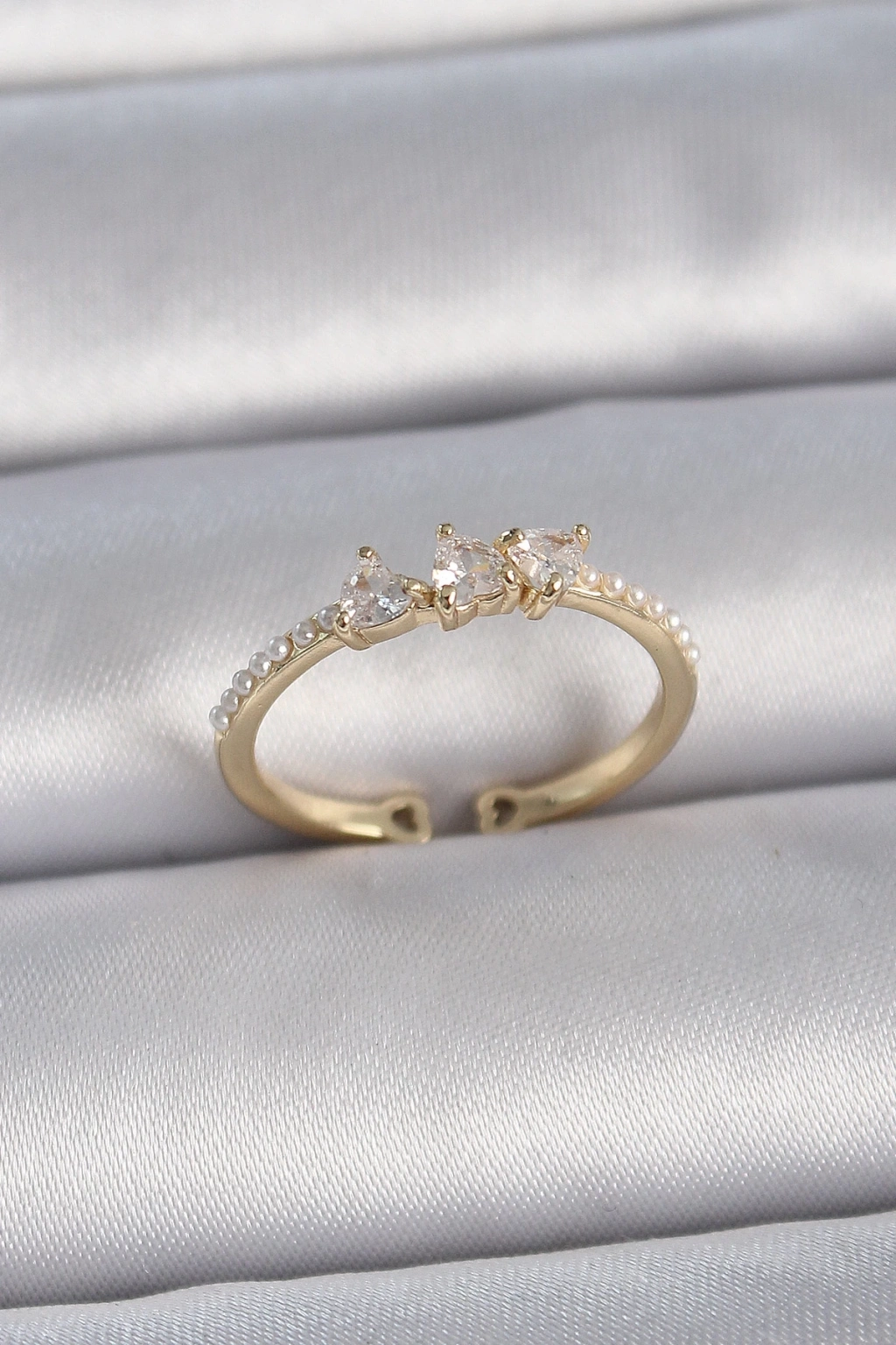® Pirinç Gold Renk Zirkon Taşlı Kalp İnci Detaylı Ayarlanabilir Model Kadın Yüzük
