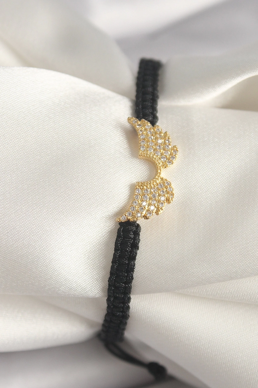 ® Pirinç Gold Renk Zirkon Taşlı Kanat Figür Asansörlü Makrome Model Kadın Bileklik