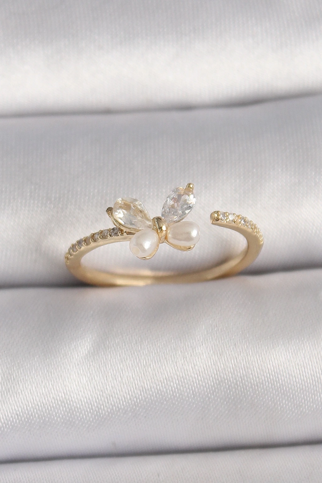 ® Pirinç Gold Renk Zirkon Taşlı Kelebek Mode İnci Detay Ayarlanabilir Yüzük
