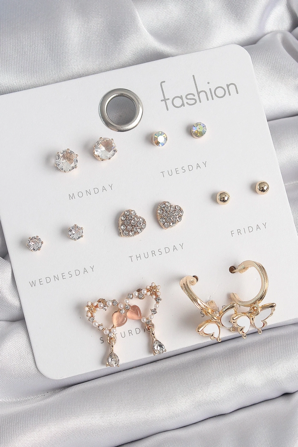 ® Pirinç Gold Renk Zirkon Taşlı Sallantılı Kalp Figür Kelebek Detay 7 Çift Kadın Küpe Seti