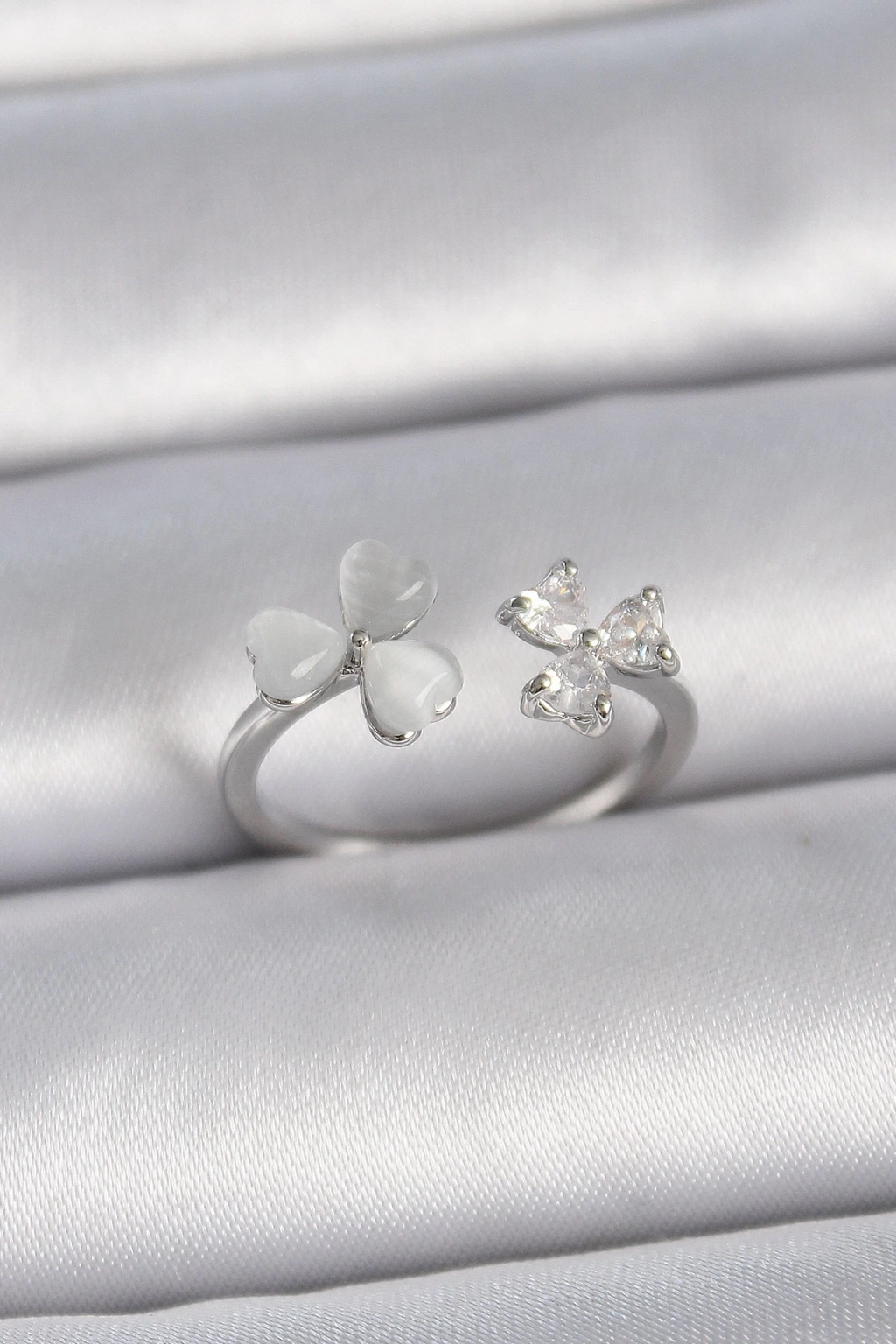 ® Pirinç Gümüş Renk Ayarlanabilir Zirkon Taşlı Beyaz Mineli Kalp Model Kadın Yüzük