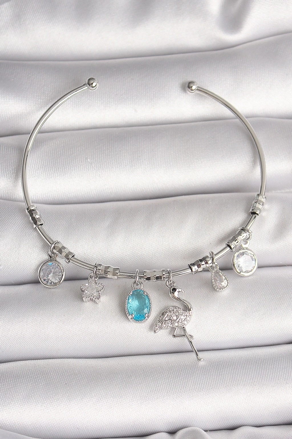 ® Pirinç Gümüş Renk Sallantı Zirkon Taşlı Filaminga Figür Charm Kadın Bileklik