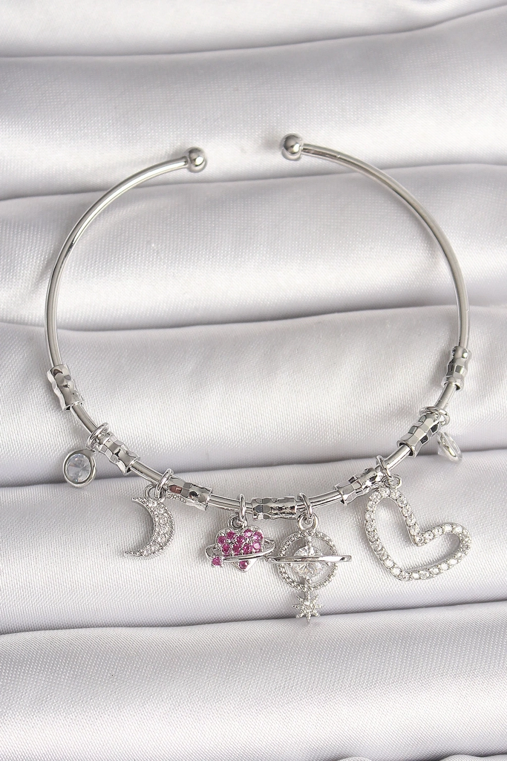 ® Pirinç Gümüş Renk Sallantı Zirkon Taşlı Gezegen Figür Kalp Detay Charm Kadın Bileklik
