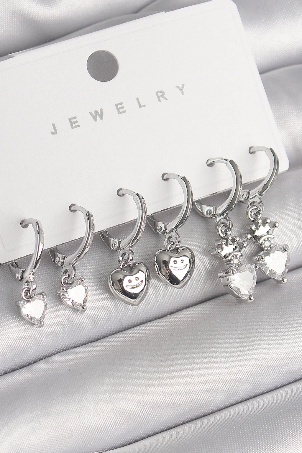 ® Pirinç Gümüş Renk Sallantı Zirkon Taşlı Kalp Model Taç Detay Kadın Küpe Seti