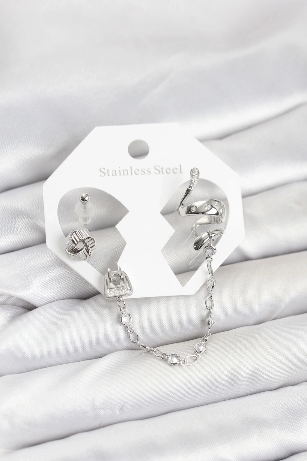 ® Pirinç Gümüş Renk Yılan Model Zincir Bağlantılı Ear Cuff Küpe Seti