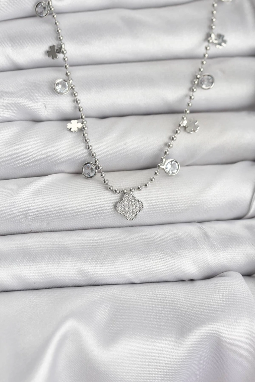 ® Pirinç Gümüş Renk Yonca Model Kadın Kolye