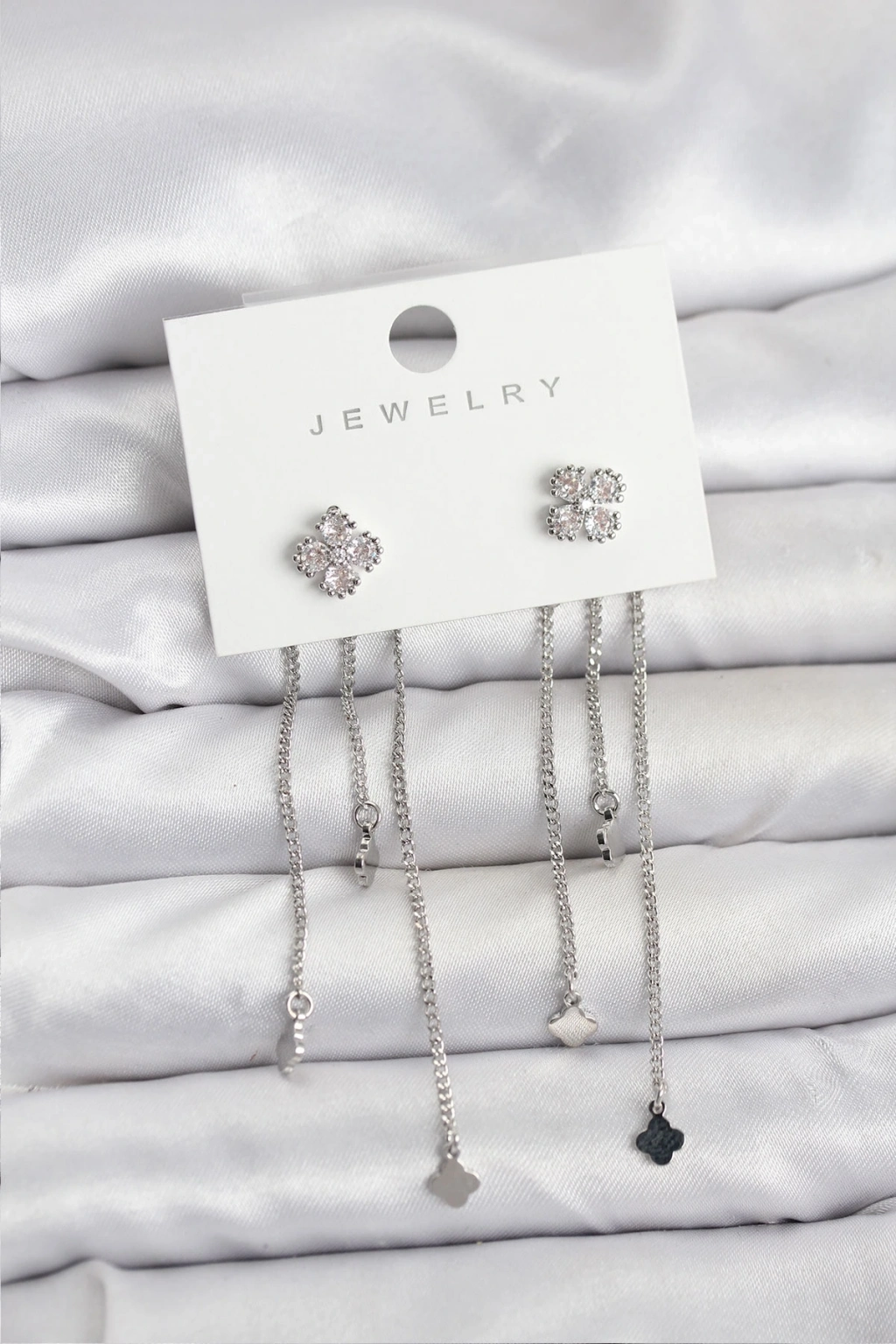 ® Pirinç Gümüş Renk Yonca Model Sallantılı Kadın Küpe