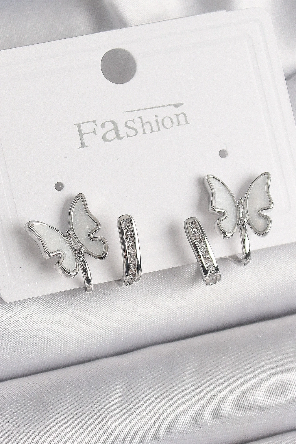 ® Pirinç Gümüş Renk Zirkon Taş Detaylı Beyaz Sedefli Kelebek Model Kadın Küpe