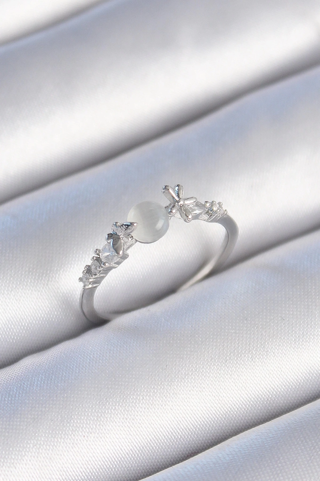 ® Pirinç Gümüş Renk Zirkon Taşlı Beyaz Mineli Kelebek Detay Kadın Yüzük