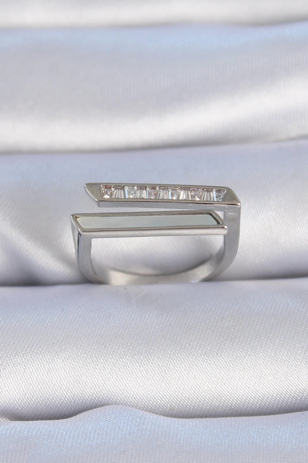 ® Pirinç Gümüş Renk Zirkon Taşlı Beyaz Sedef Detay Kadın Yüzük