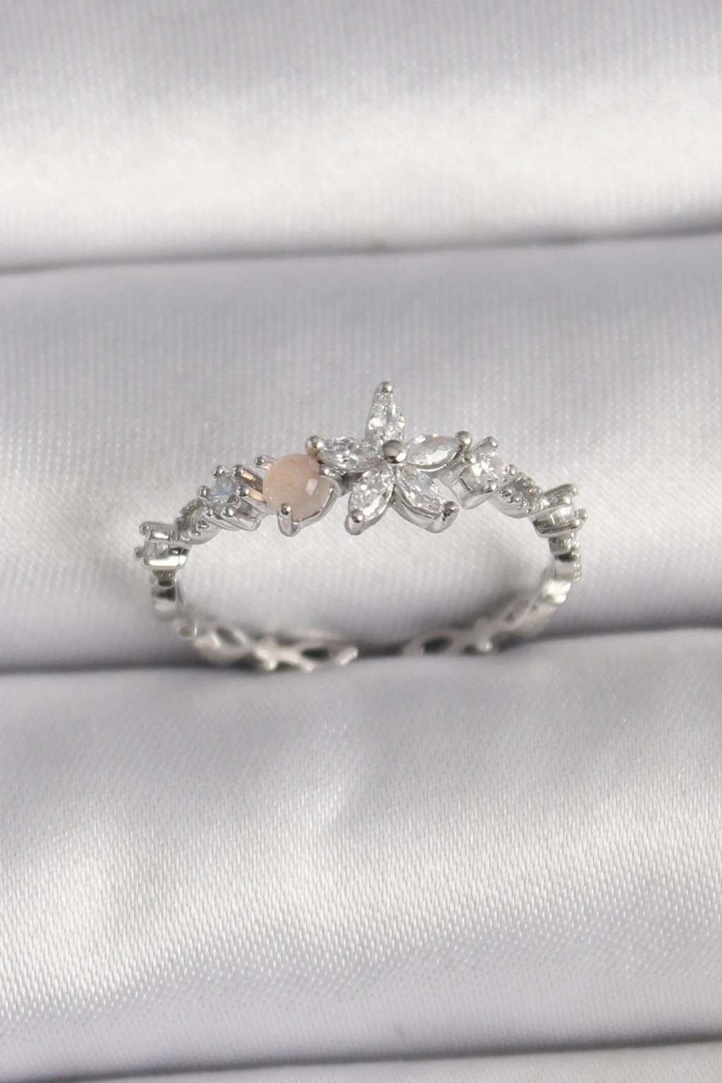 ® Pirinç Gümüş Renk Zirkon Taşlı Çiçek Model Ayarlanabilir Yüzük