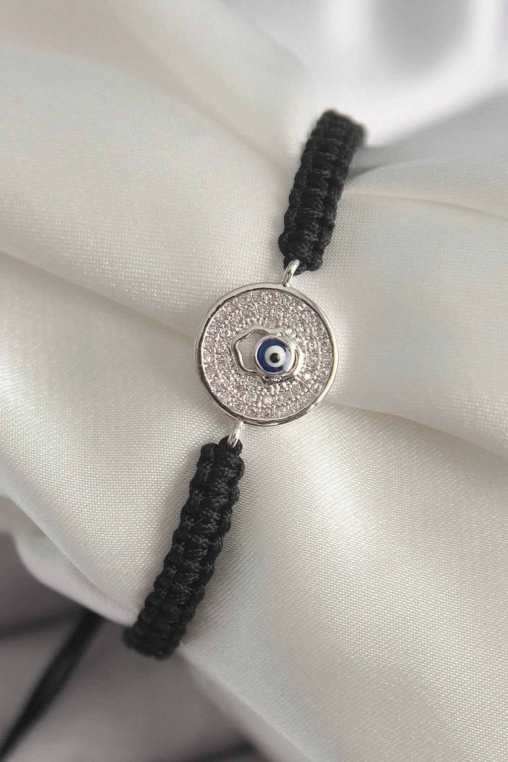 ® Pirinç Gümüş Renk Zirkon Taşlı Nazar Boncuk İşleme Makrome Asansörlü Model Kadın Bileklik