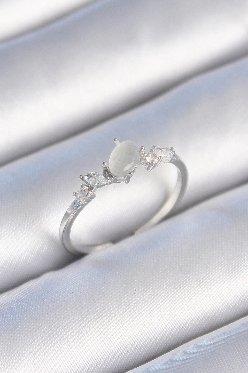 ® Pirinç Gümüş Renk Zirkon Taşlı Oval Beyaz Mineli Kadın Yüzük
