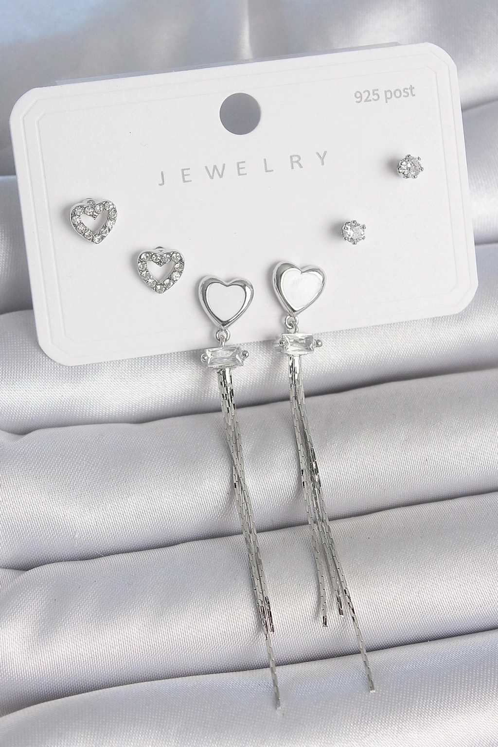 ® Pirinç Gümüş Sallantı Beyaz Mineli Kalp Model Zirkon Taşlı Kalp Detay 925 Ayar Gümüş Çivi Kadın Küpe Seti
