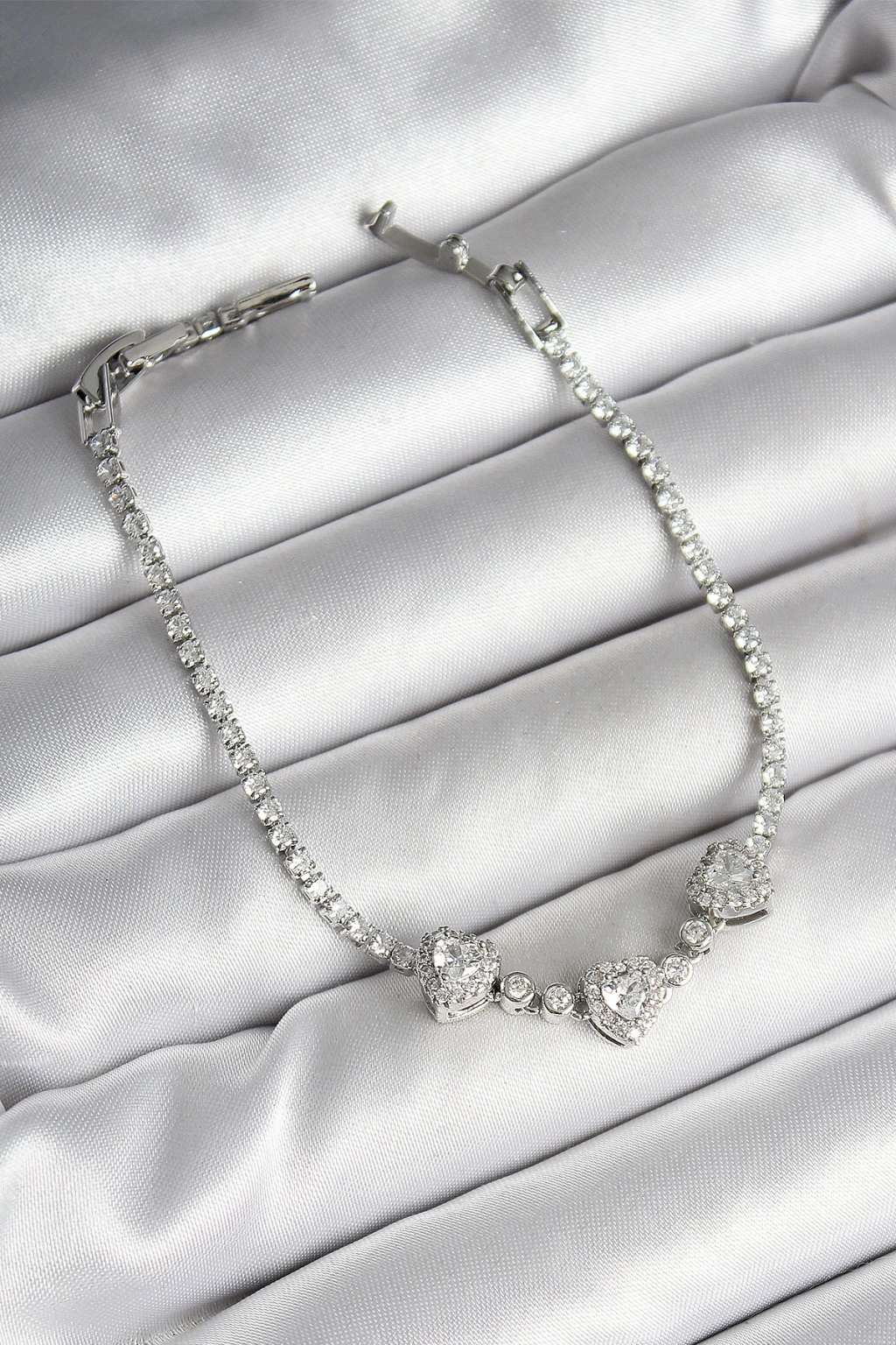 ® Pirinç Sıralı Kalp Figürlü Zirkon Taşlı Gümüş Renk Kadın Bileklik