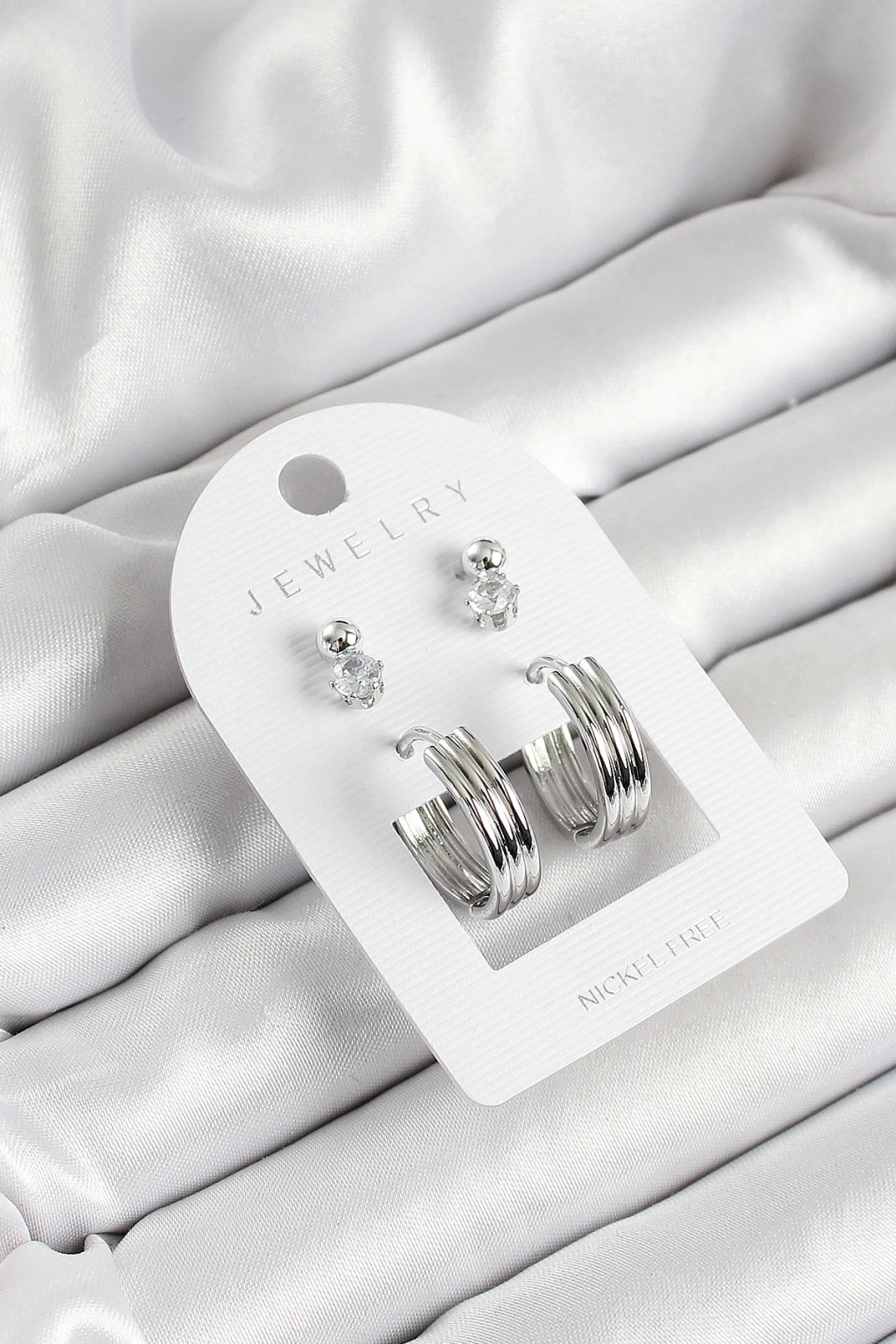 ® Pirinç Zirkon Taş Ve Halka Figürlü Gümüş Renk 3'lü Çift Kadın Küpe Set