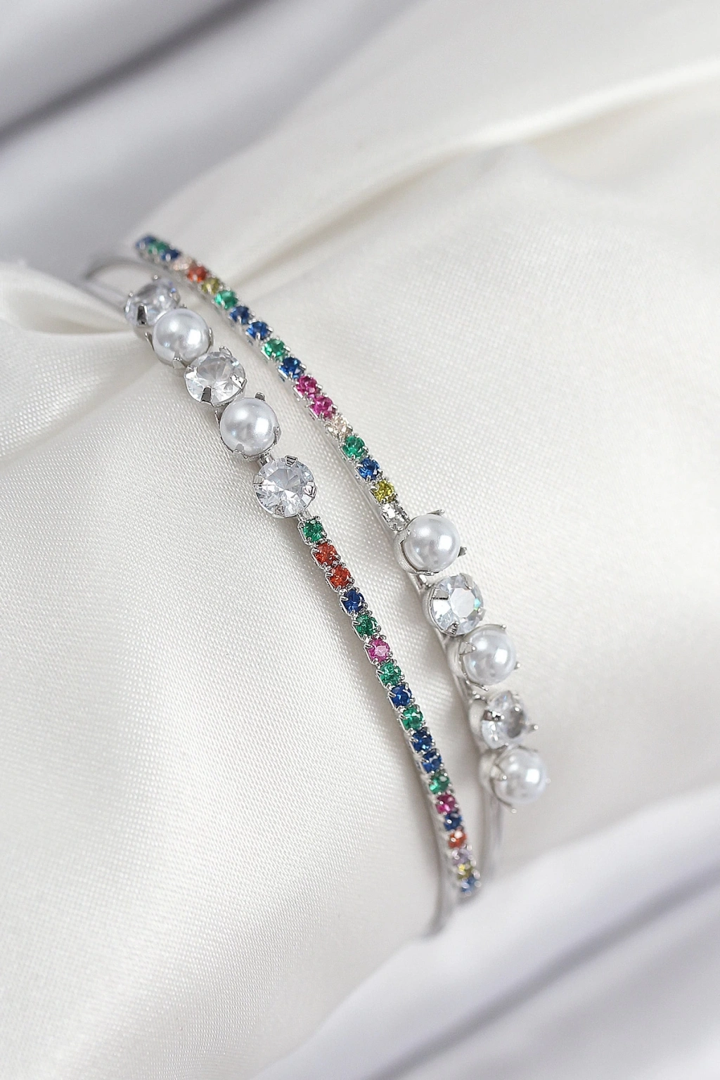 ® Pirinç Zirkon Taşlı İnci Model Gümüş Renk Kadın Bileklik