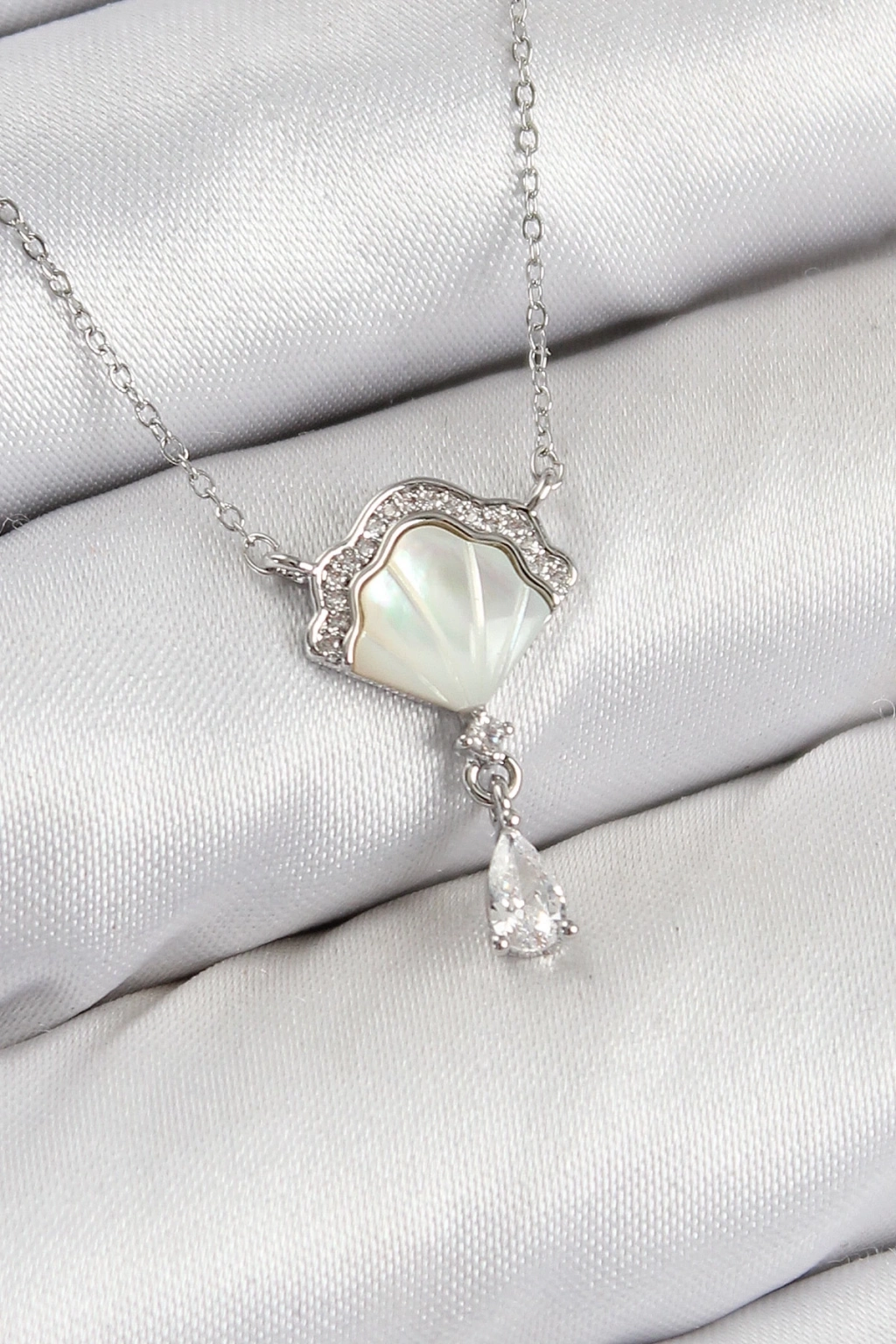 ® Pirinç Zirkon Taşlı İstiridye Model Gümüş Renk Kadın Kolye