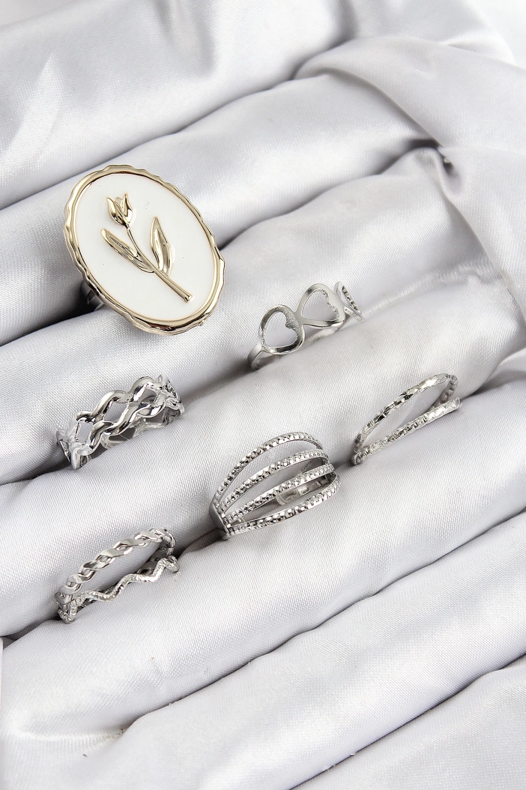 ® Pirinç Zirkon Taşlı Lale Model Gümüş Renk Kadın Yüzük Kombin Set
