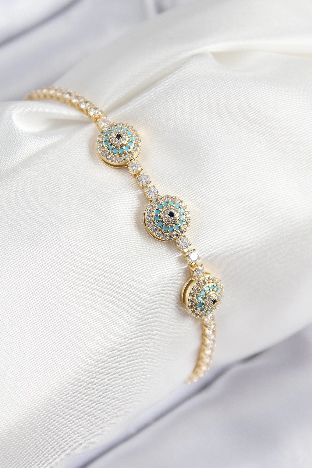 ® Pirinç Zirkon Taşlı Nazar Model Gold Renk Kadın Bileklik