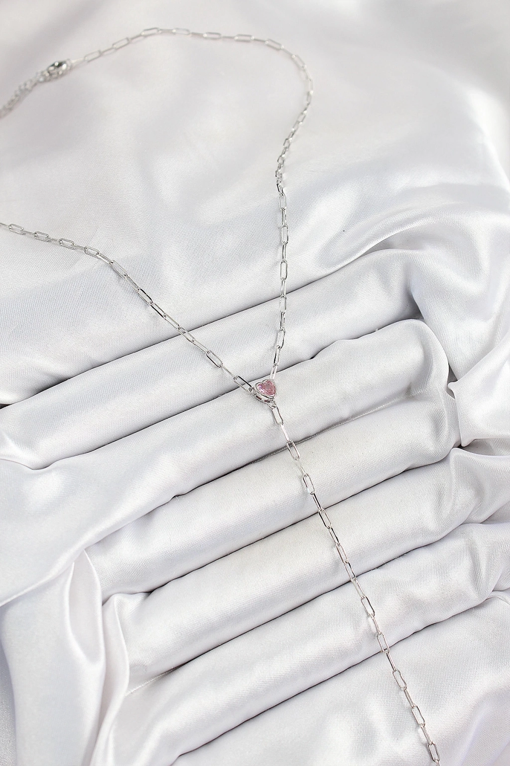 ® Pirinç Zirkon Taşlı Pembe Kalp Figürlü Y Model Gümüş Renk Kadın Kolye