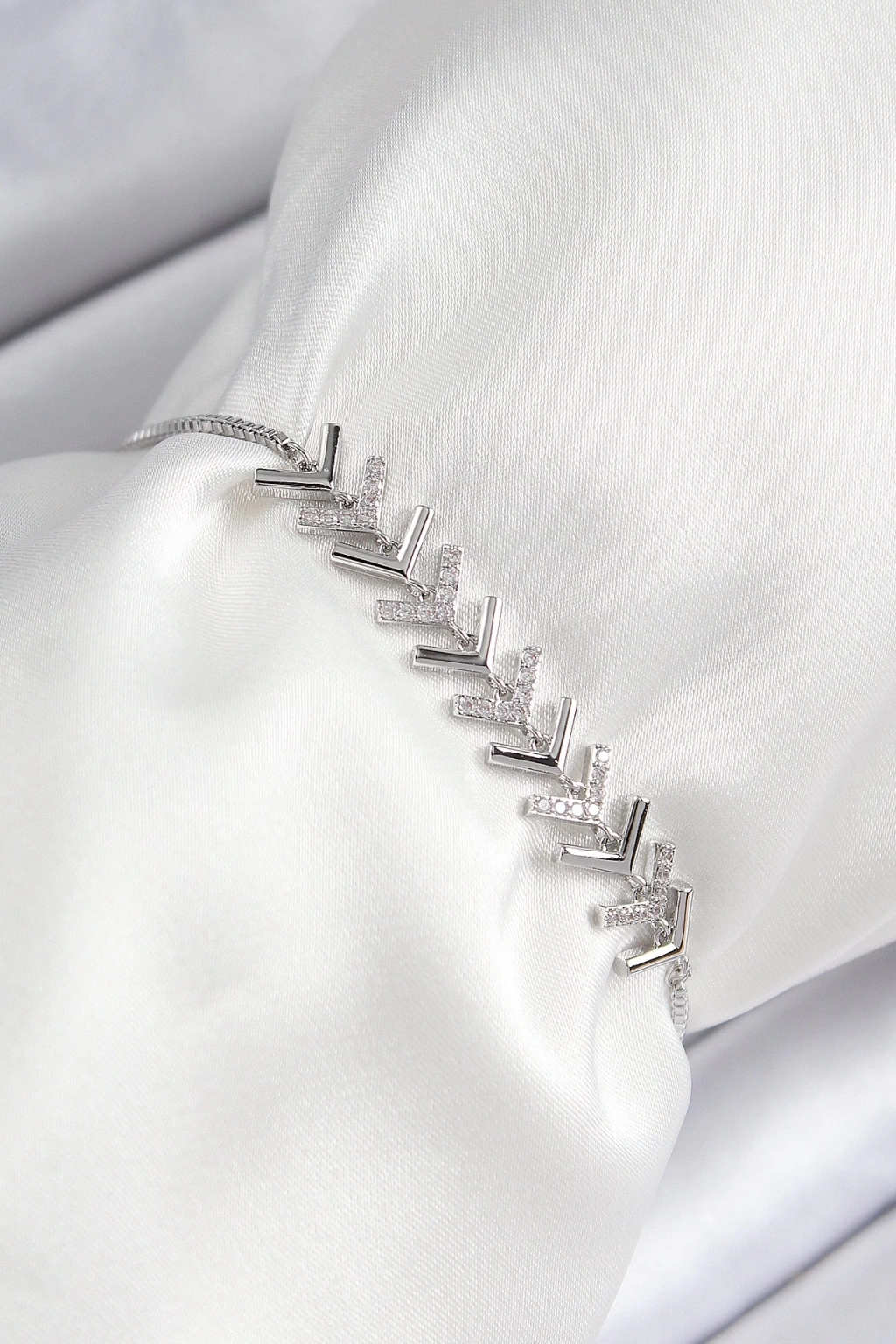® Pirinç Zirkon Taşlı Sıralı Ok Model Gümüş Renk Asansörlü Kadın Bileklik