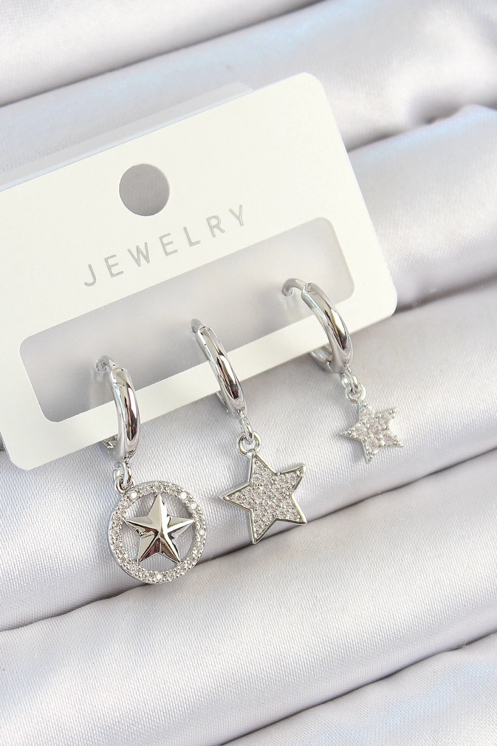 ® Pirinç Zirkon Taşlı Yıldız Model Gümüş Renk 3'lü Çift Kadın Küpe Set