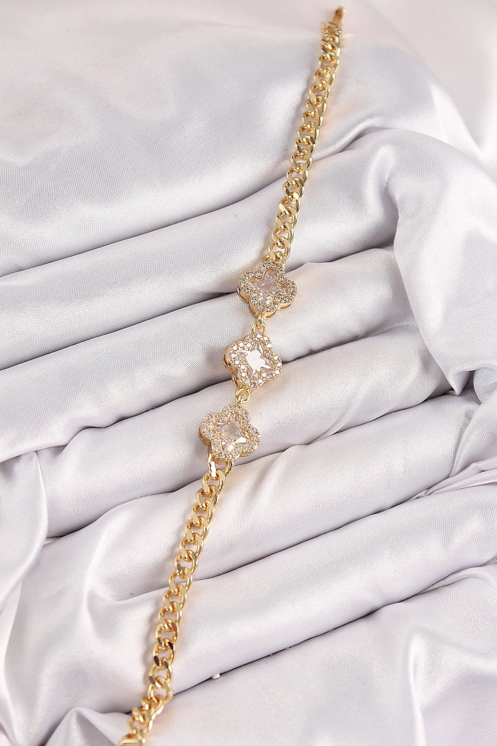 ® Pirinç Zirkon Taşlı Yonca Model Gold Renk Kadın Bileklik