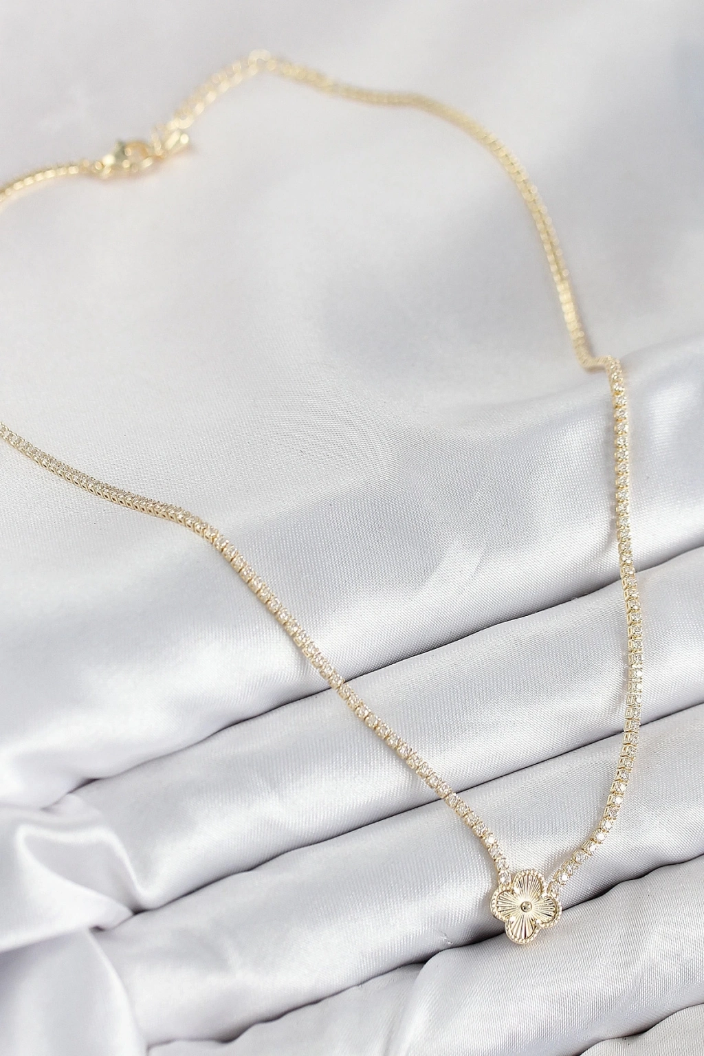 ® Pirinç Zirkon Taşlı Yonca Model Gold Renk Kadın Kolye