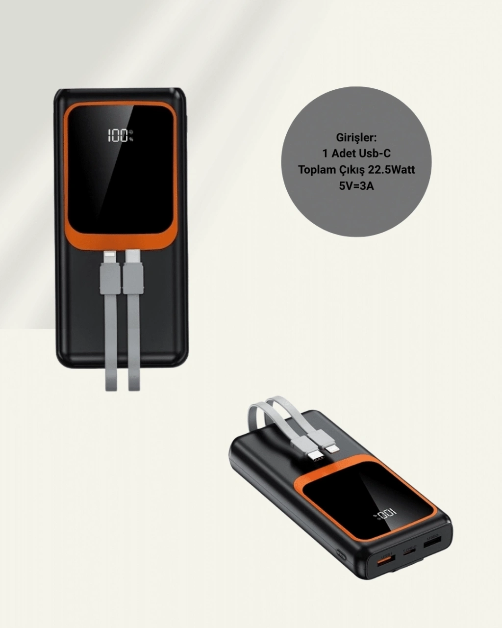 ® Powerbank 20000 mAh | 22.5W Hızlı Şarj, Dahili Kablolu, LCD Ekranlı Şarj Cihazı