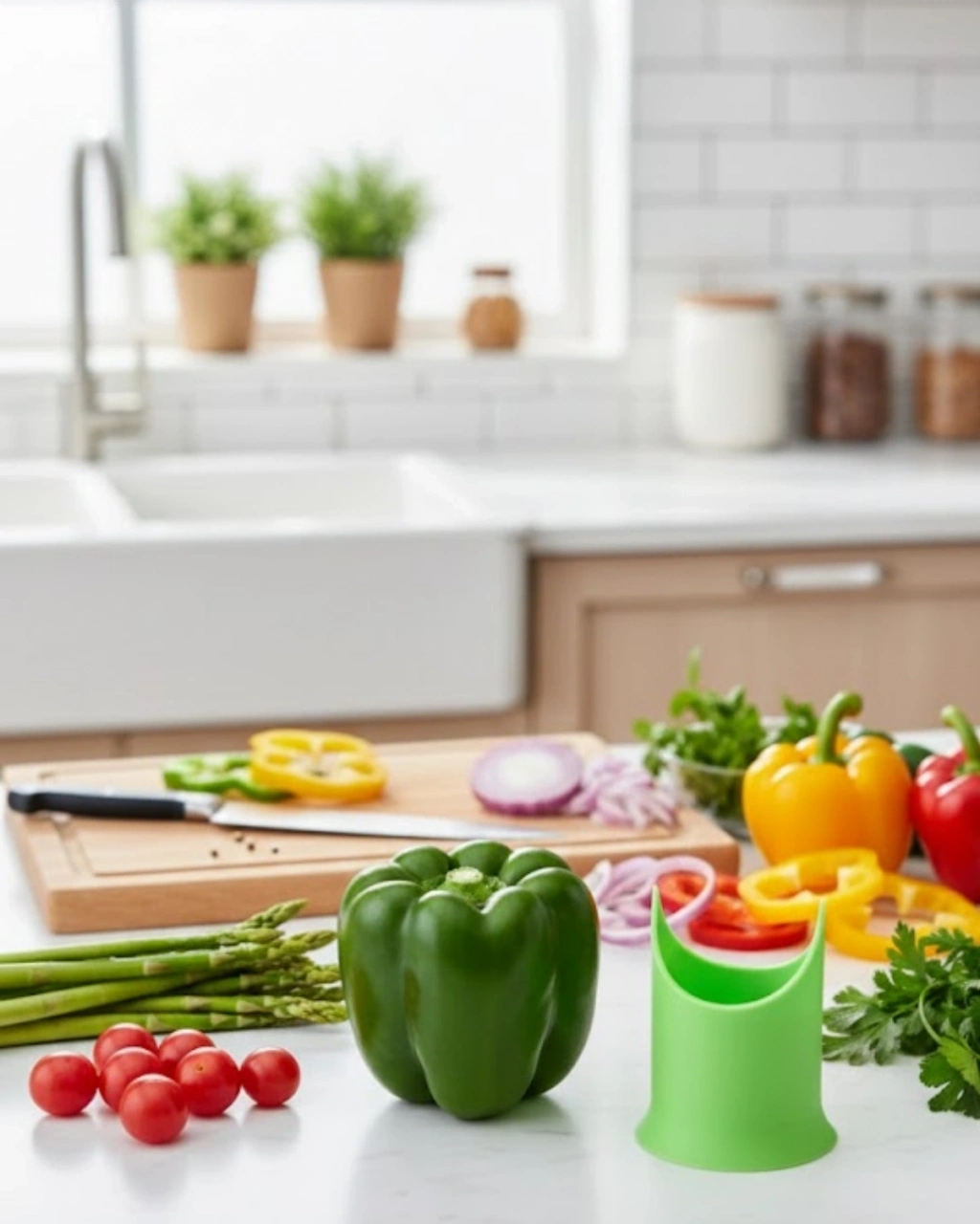 Sebze iç temizleyici aparat, biber ve kabak çekirdeklerini hızlı ve zahmetsiz şekilde çıkarmak için geliştirilmiştir. Özellikle dolma ve sağlıklı yemek hazırlığında büyük kolaylık sağlar. Sebzenin iç kısmını tek hamlede temizler, pürüzsüz bir sonuç elde edilmesine yardımcı olur. Kompakt yapısı sayesinde taşınması ve saklanması kolaydır. Dayanıklı silikon yapısı uzun süreli kullanım sunar. Mutfakta düzeni ve hızı bir arada isteyenler için ideal bir yardımcıdır.