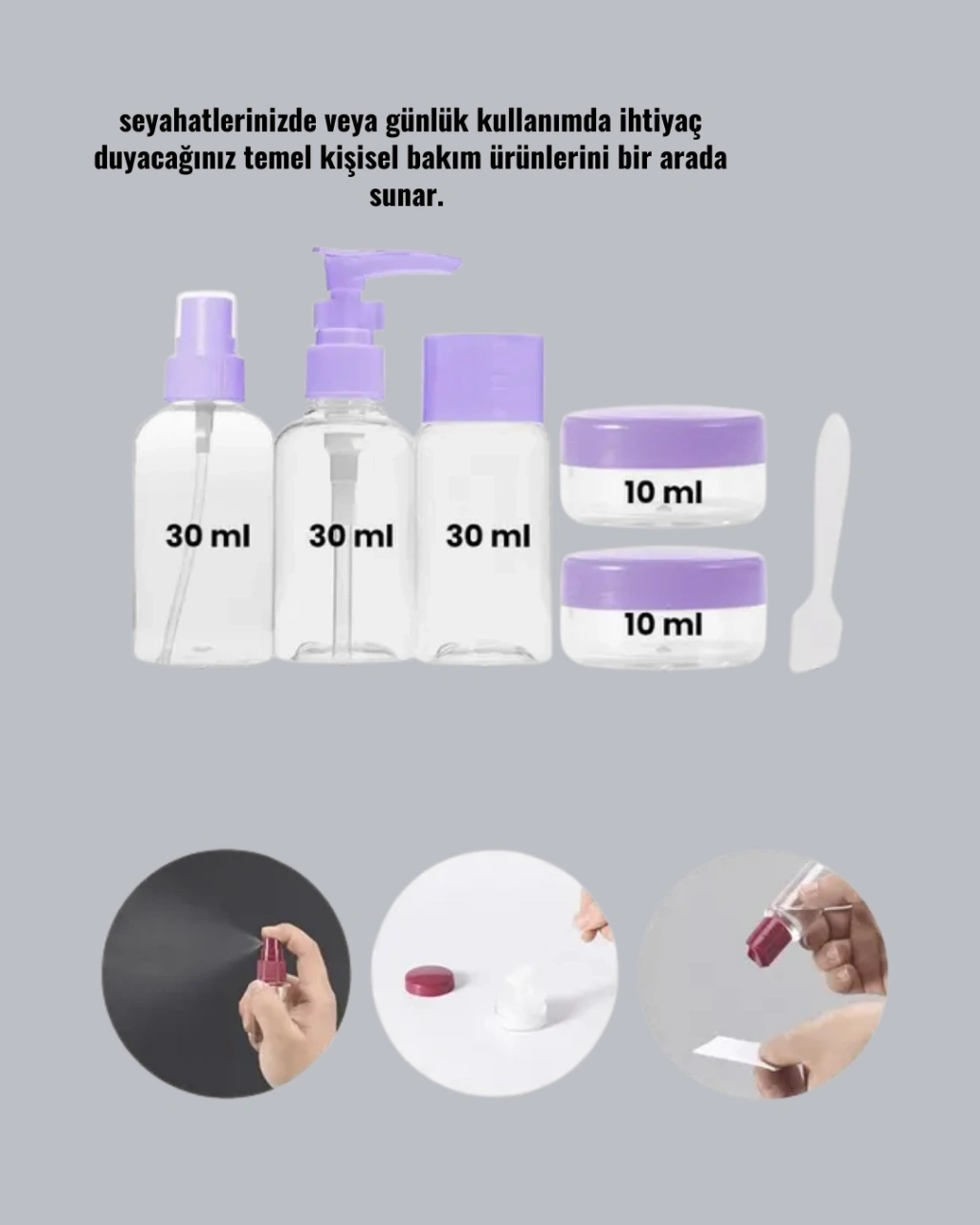 Seyahatlerde, tatillerde veya günlük hayatta kişisel bakım ürünlerini yanınızda taşımak isteyenler için tasarlanan 5 Parça Seyahat Banyo Seti, kompakt boyutları ve kullanışlı yapısıyla büyük kolaylık sağlar. Set, 30 ml'lik şişe, sprey, şampuanlık ve iki adet krem kutusundan oluşur. Tüm parçalar dayanıklı, şeffaf ve estetik bir materyalden üretilmiştir. İçeriği kolayca görebilmenizi sağlayan bu şeffaf tasarım, düzenli kullanım için büyük avantaj sunar. Sızdırmaz kapak sistemi ile yolculuk sırasında dökülmeleri engeller. Pratik taşıma çantası sayesinde ürünler çantanızda dağılmaz ve hijyenik şekilde korunur. Hem uçak seyahatlerinde hem spor salonunda hem de günlük kullanımda ihtiyaçlarınızı karşılayacak ideal boyutlara sahiptir. Kompakt ve hafif yapısıyla yer kaplamadan taşınabilir. Estetik tasarımı sayesinde her yaşa ve kullanıcıya hitap eden bir üründür. Renkler karışık gönderilir.