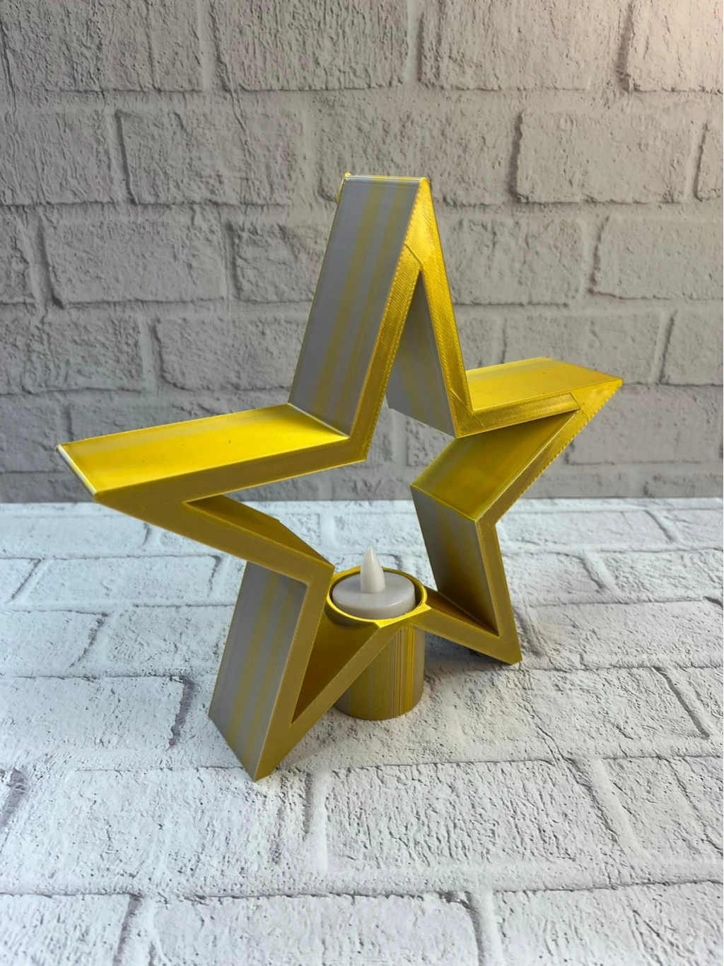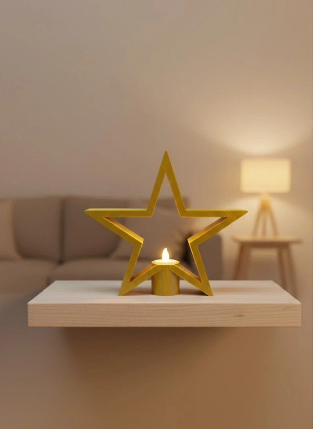 Dekoratif sarı yıldız mumluk, sıcak tonuyla yaşam alanlarına canlılık kazandırır. Raf üstü veya masa üzerinde kullanıldığında mekâna derinlik ve şıklık katar. Mum ışığıyla birlikte loş bir aydınlatma sağlayarak rahatlatıcı bir salon atmosferi oluşturur. Estetik ve işlevsel tasarımıyla ev ve ofis dekorasyonu için şık bir tamamlayıcıdır.