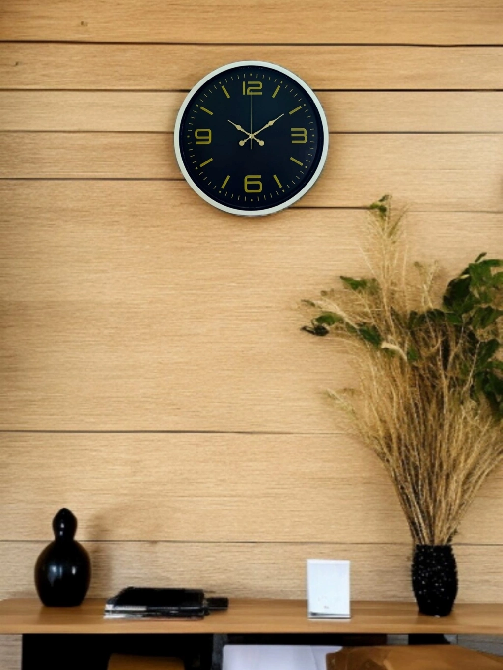 Krem renkli çerçevesi ile koyu zemin üzerindeki gold tonlu rakamları ve zarif akrep-yelkovan tasarımı sayesinde bu 36 cm duvar saati, bulunduğu ortama klasik ve sofistike bir hava katar. Net ve dengeli kadran yapısı, saatin her açıdan rahatlıkla okunmasını sağlar. Hem modern hem de klasik dekorasyon stilleriyle uyumlu, zamansız bir tasarıma sahiptir.