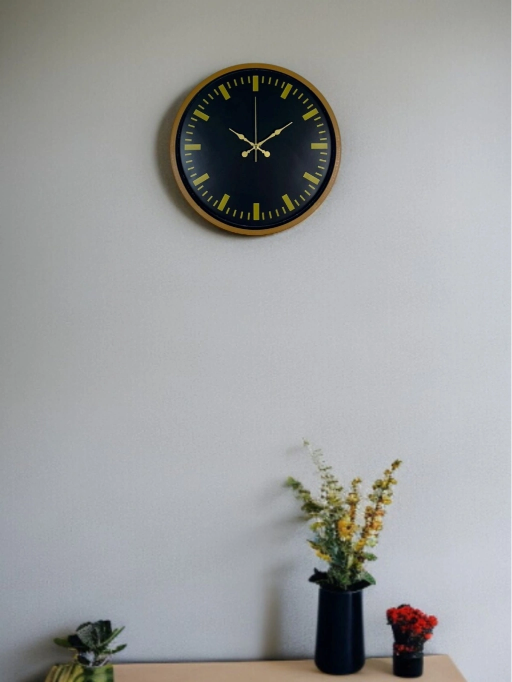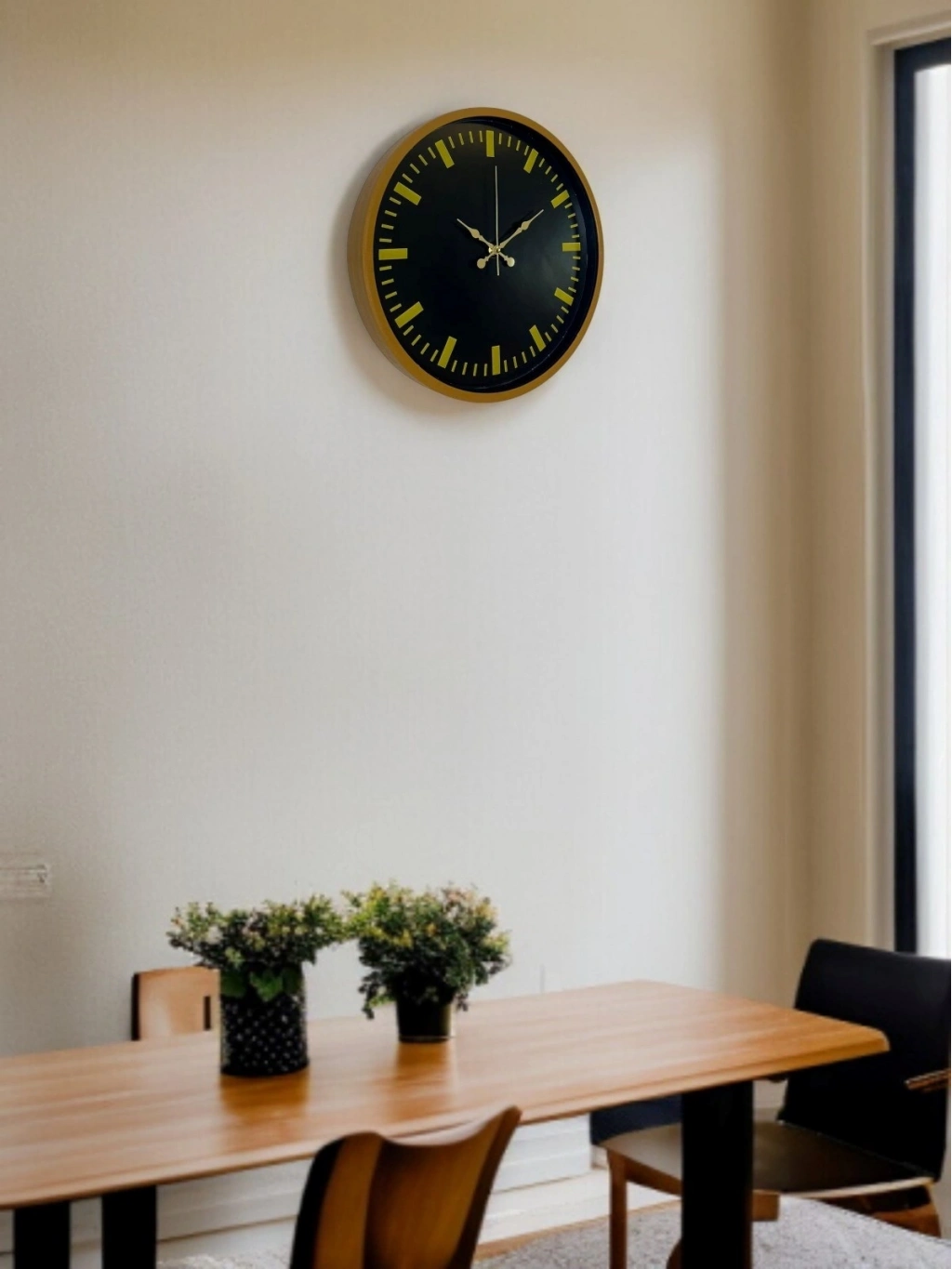 Kahverengi çerçevesi, siyah kadranı ve gold tonlu indeksleriyle tasarlanan bu 36 cm duvar saati; modern çizgileriyle bulunduğu ortama şık ve dengeli bir görünüm kazandırır. Rakam yerine kullanılan gold çizgisel göstergeler, sade ve sofistike bir stil sunarken saatin okunabilirliğini de artırır.