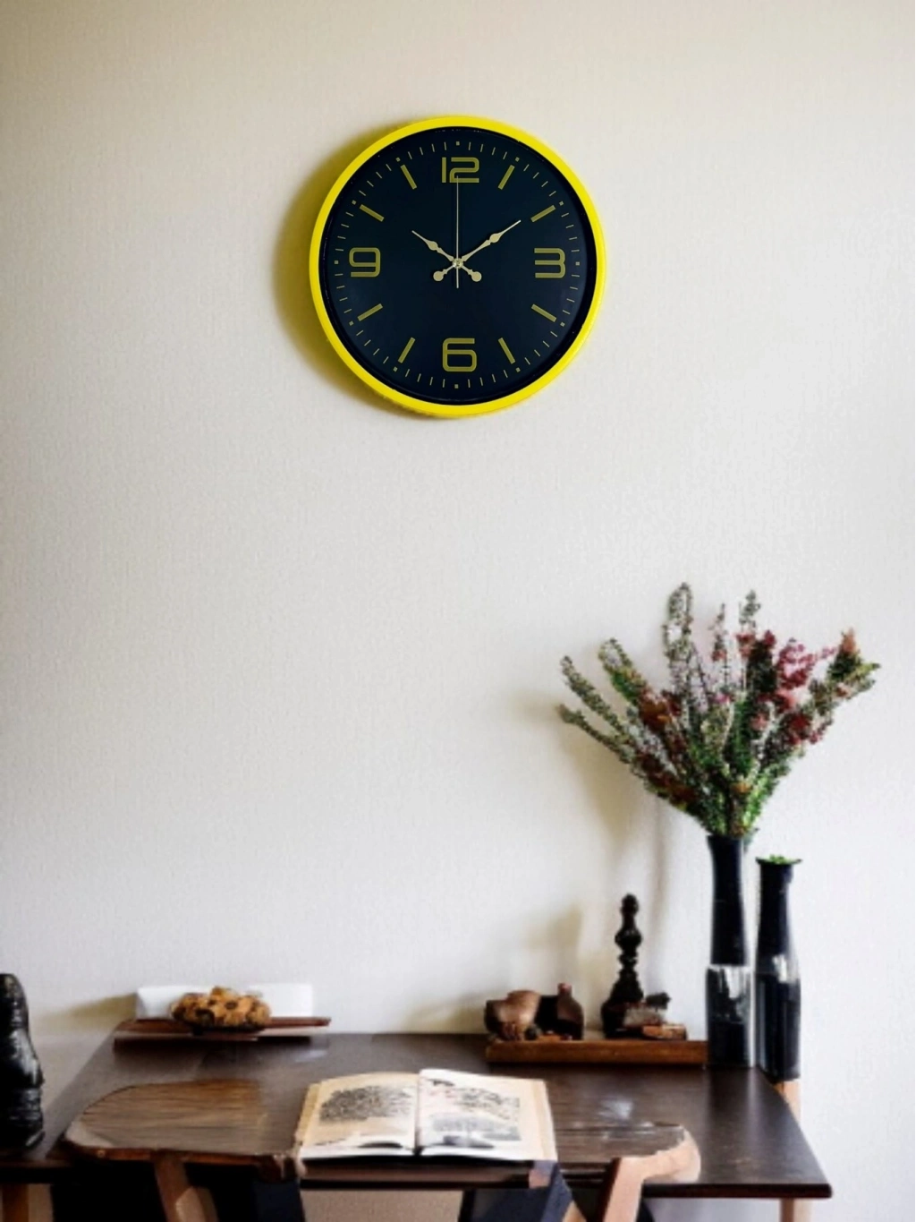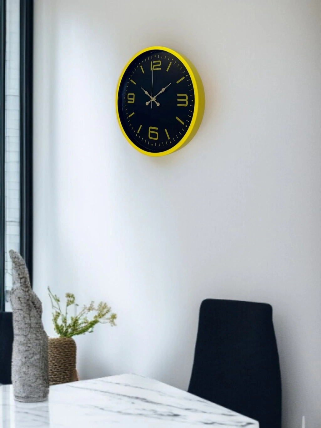 Canlı sarı çerçevesi ve koyu renk kadran tasarımıyla öne çıkan bu 36 cm duvar saati, bulunduğu ortama enerji ve modern bir karakter kazandırır. Altın tonlu rakamları ve kontrastlı kadran yapısı sayesinde saati uzaktan bile rahatlıkla okumak mümkündür.