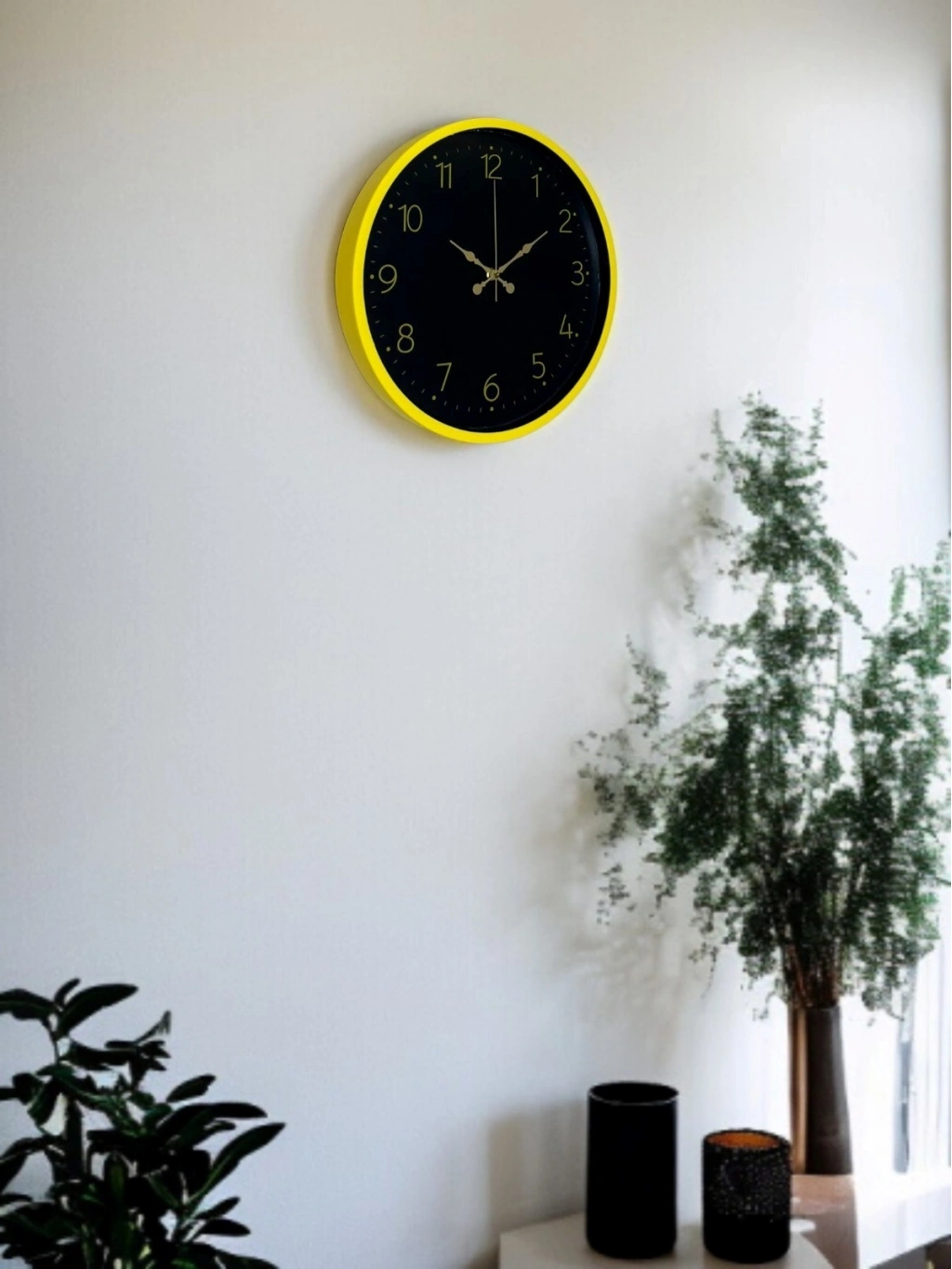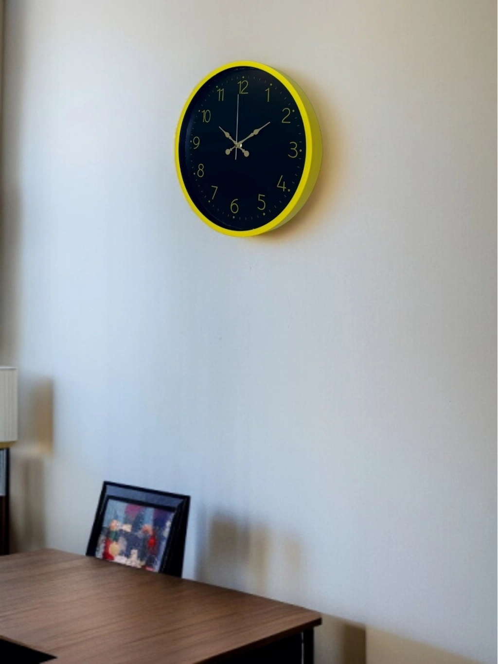 Canlı sarı çerçevesi ve koyu renk kadran tasarımıyla öne çıkan bu 36 cm duvar saati, bulunduğu ortama enerji ve modern bir karakter kazandırır. Altın tonlu rakamları ve kontrastlı kadran yapısı sayesinde saati uzaktan bile rahatlıkla okumak mümkündür.