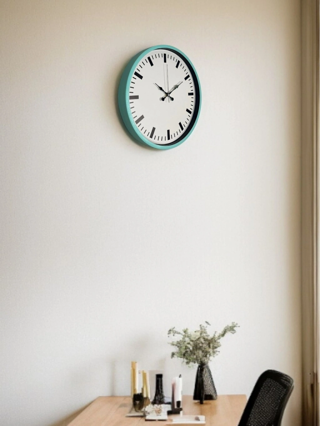 Turkuaz çerçevesiyle bulunduğu ortama canlılık ve ferahlık katan bu 36 cm duvar saati, sade kadran tasarımıyla modern dekorasyonlara şık bir uyum sağlar. Beyaz zemin üzerine yerleştirilen siyah çizgi indeksler, saatin okunurluğunu artırırken minimal bir görünüm sunar.