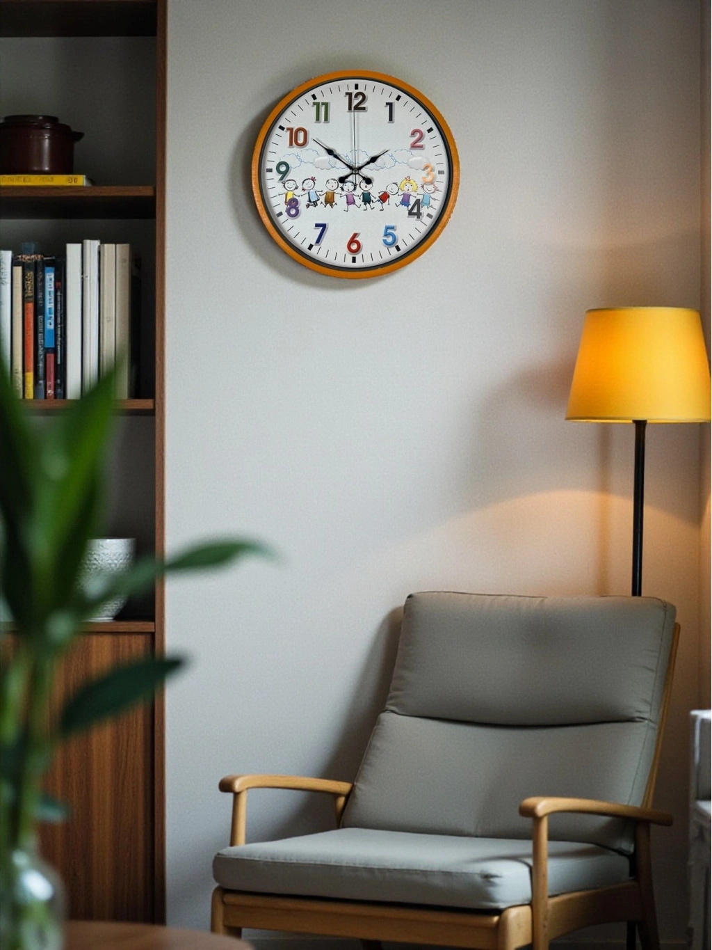 Canlı turuncu çerçevesi, renkli rakamları ve sevimli çocuk figürleriyle tasarlanan bu 36 cm duvar saati, çocuk odalarına enerji ve neşe katar. Eğlenceli kadran tasarımı sayesinde çocukların saati öğrenmesini desteklerken, odanın dekorasyonunu da tamamlar.