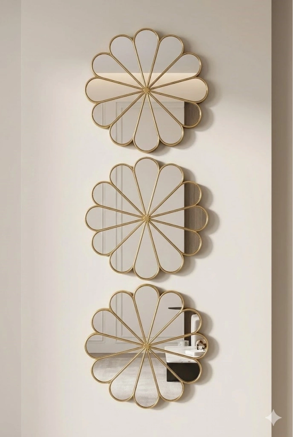 Evinize şıklık ve modern bir dokunuş katmak için tasarlanan 3’lü gold güneş desenli duvar aynası seti, zarif görünümü ve kompakt ölçüsüyle her alana uyum sağlar.