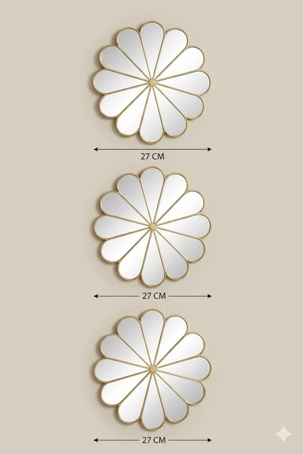 Her bir ayna 27 cm çapındadır ve 3 adet aynadan oluşan set halinde gönderilir. Ürün, abartılı büyük aynalar yerine gerçek ölçülerde, dekoratif tamamlayıcı olarak tasarlanmıştır. Bu sayede salon, yatak odası, antre, hol ve ofis duvarlarında dengeli ve estetik bir görünüm sunar.