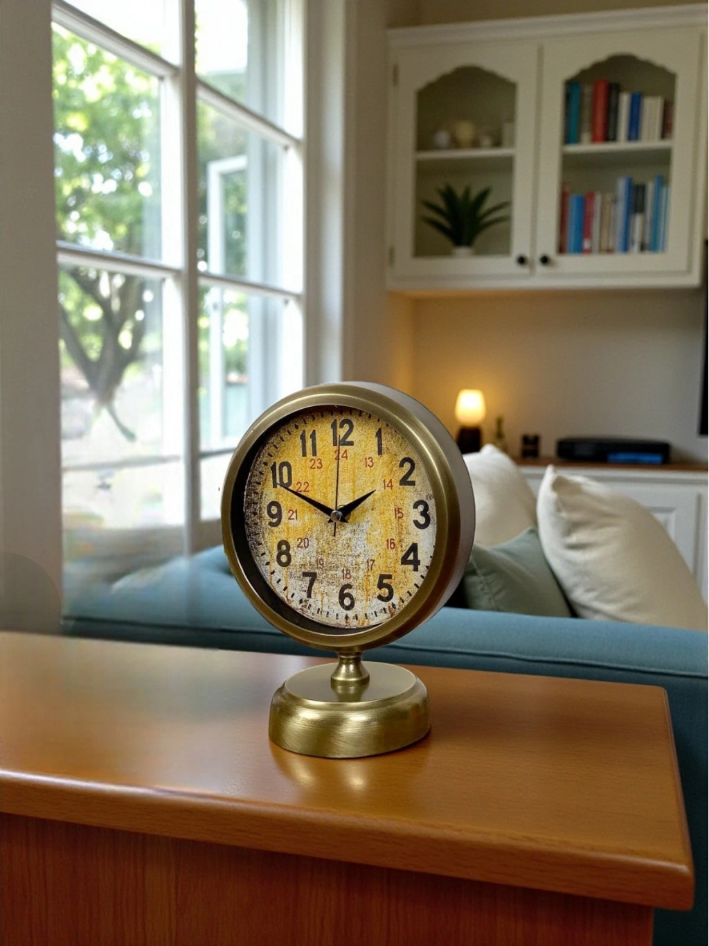 Nostaljik detayları ve güçlü eskitme dokusuyla öne çıkan bu vintage masa saati, geçmişin ruhunu modern yaşam alanlarına taşıyan özel bir dekoratif üründür. Yoğun eskitme efektli sarı–bej tonlu kadranı, klasik saat tasarımını sevenler için karakterli ve dikkat çekici bir görünüm sunar. Siyah rakamlar ve kontrast oluşturan detaylar sayesinde saat, estetik olduğu kadar fonksiyonel bir kullanım da sağlar.